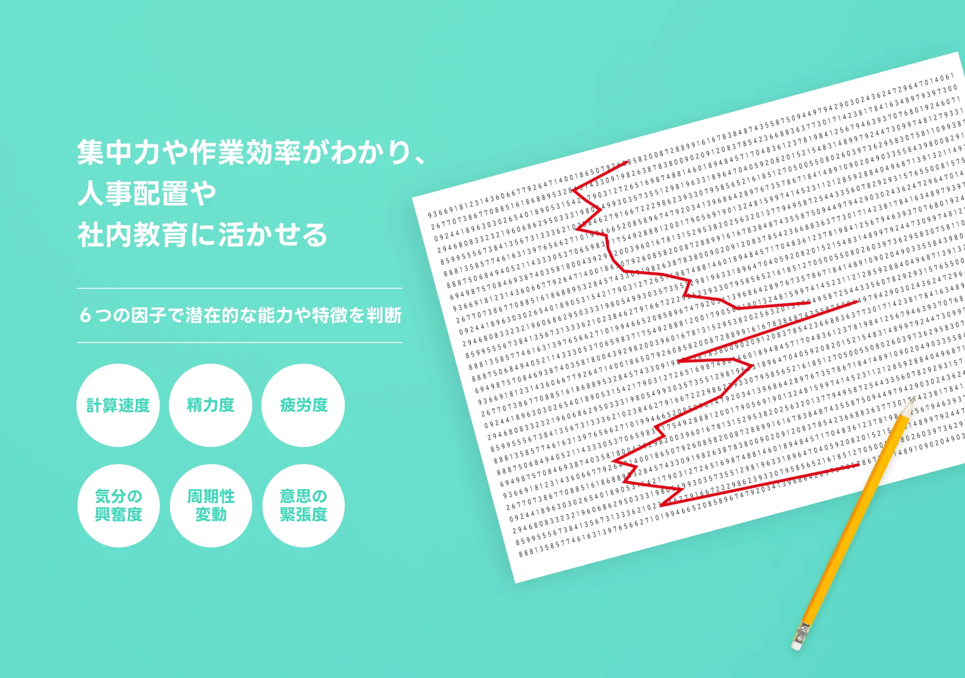 クレペリン検査は、簡単な一桁の足し算を行い、受検者の行動特性を把握できる「作業検査」です。当社では、創設者の辻岡美延がクレペリン検査のコンピュータ判定の開発に携わって以来、研究・実績を重ね、多くの資料を蓄積。科学的根拠のある信頼性の高い検査結果を提供することが可能です。